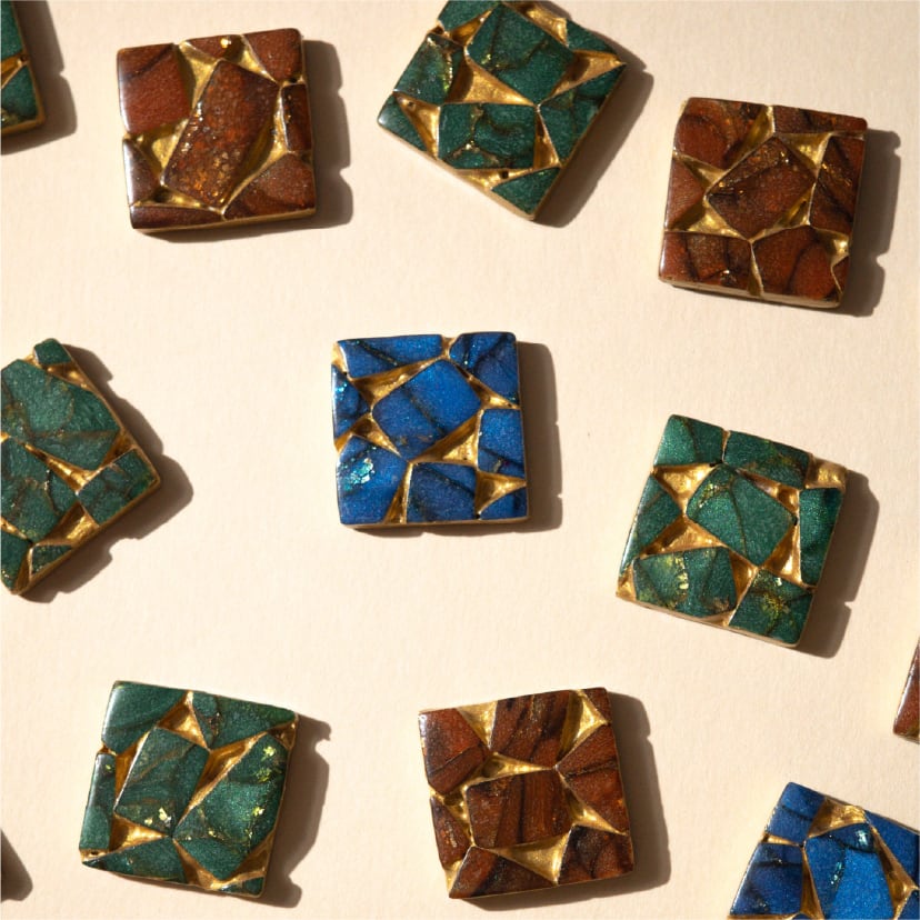 赤みのあるあたたかなブラウンの中に金色が煌めくアートピースのような耳飾り。 いろいろなお洋服に合わせやすいカラーです。 名前のtessara(テッサラ)は、古代ギリシャやローマ時代のモザイクのカケラ、tessera(テッセラ)からきています。 デザインにはポリマークレイとアクリルインクを使い、上から樹脂・ニスコーティングを施しています。 こちらの作品は画像にてそれぞれの柄を載せております。 「種類を選択する」にてA・B・C・Dからお選びください。 (1点ものとなっておりますので、在庫がない場合はご選択いただけません。ご了承くださいませ) ピアス・またはイヤリングからお選びいただけます。 ↓↓お手数おかけいたしますが、金具の詳細は下記のリンクからご確認ください。 https://hogudesign.base.shop/p/00001 ※金具のご選択がなしの方は、こちらからご確認のご連絡をいたします。1週間ほどご連絡がつかない場合はご購入のキャンセルをさせていただきますので、あらかじめご了承くださいませ。 サイズ 縦:約20mm 横:約20mm (手工芸品のため大きさには若干のばらつきがあります) <素材について> ポリマークレイという焼くと固くなる素材で作成したアクセサリーです。軽量な為、長時間着用しても痛くなりにくい特徴があります。 <作品について> ⚫︎金属金具以外は全て手作業で制作しており、すべての作品が1点ものです。 ⚫︎十分に気をつけて制作しておりますが、制作過程にて生じる若干の歪みや気泡、埃などがある場合がございます。ご理解ご了承のほどよろしくお願いいたします。 ⚫︎作品写真はなるべく実際の色味に近づけて撮影しておりますが、お使いのモニターや照明などの光源によってはお色が異なる場合がございます。 <金具部分について> こちらはデザイン部分には金属は使用しておりません。 金具についてはアレルギー対応のニッケルフリーやサージカルステンレス(ゴールドはニッケルフリーメッキ加工)のなどのご用意がございますが、全ての方にアレルギー反応が起こらないものではございませんので、異常を感じましたらすぐに外していただきますようにお願い申し上げます。 <取り扱いのご注意> ⚫︎ポリマークレイは水に強い素材ですが、金具の部分は劣化してしまいますので、水に濡れた場合は拭き取っていただけますようお願いいたします。 ⚫︎過度な力を加えると破損の恐れがありますので、優しくお取り扱いください。特に金具の繋ぎ目部分がある場合は、負荷をかけすぎると割れてしまう可能性がございますので、強くひっぱたりせず、金具部分を持って着脱いただくようお願いいたします。 ⚫︎レジンコーティングをしている作品は、高温多湿を避けて保管いただけますと長持ちいたします。