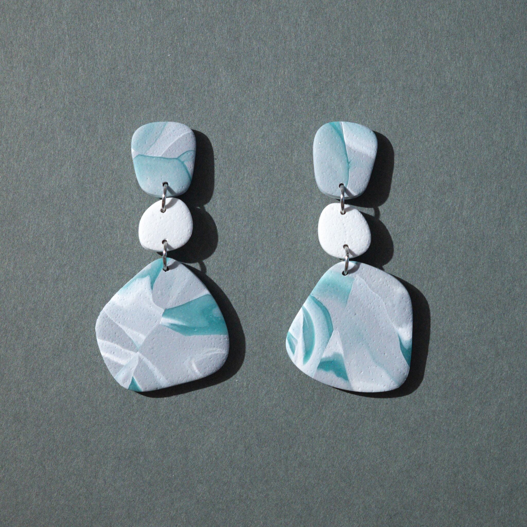 こちらは小石のような自然で有機的な形をつなげた3連ダングルです。