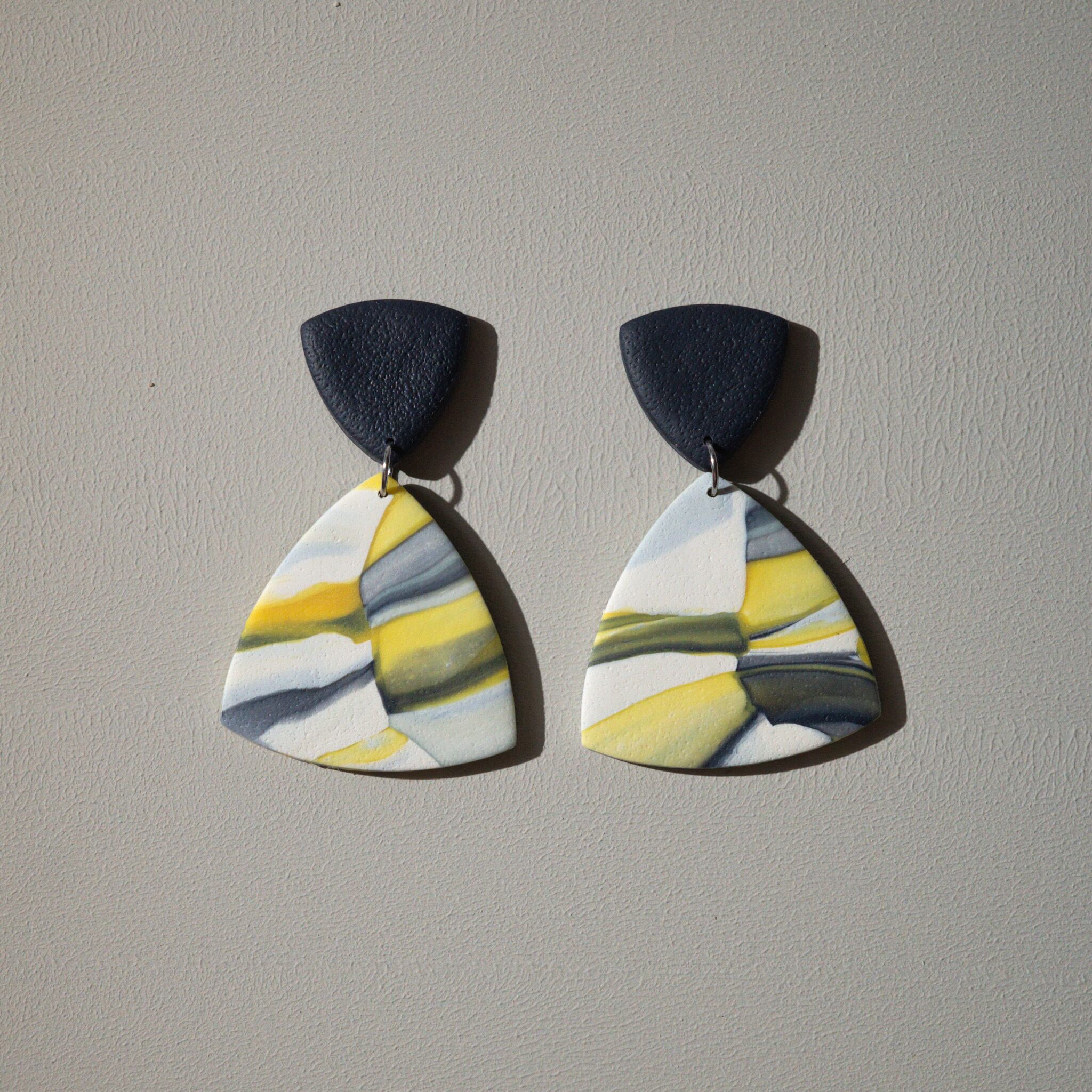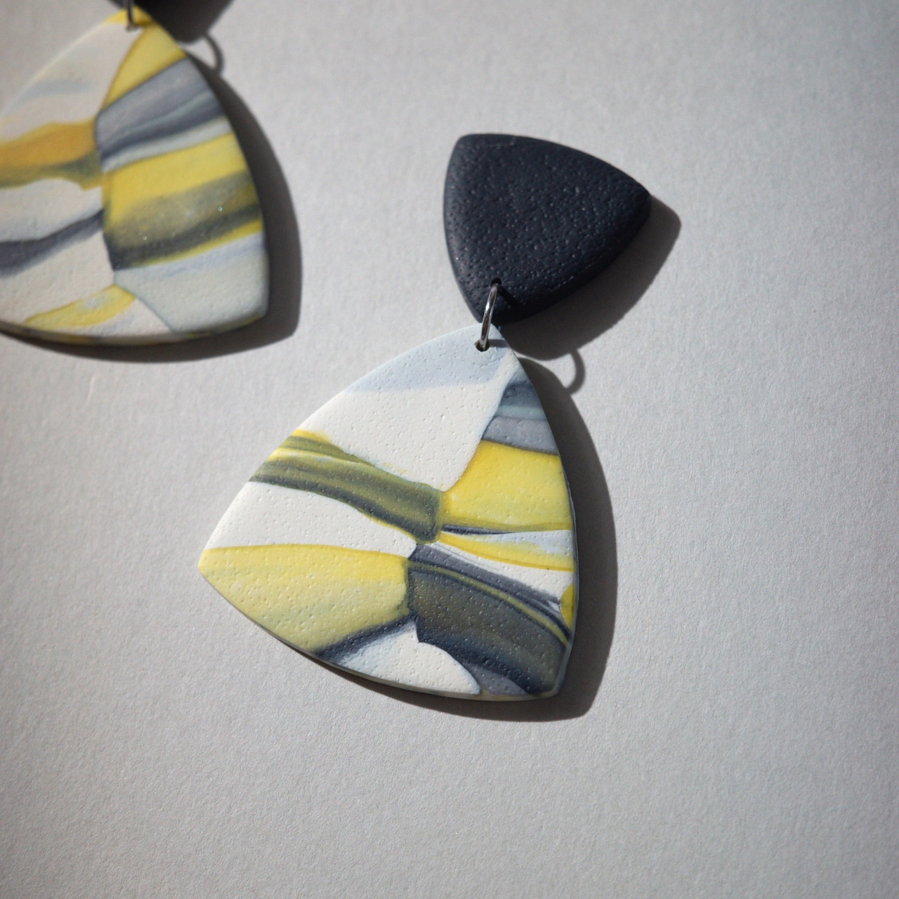 こちらは丸みを帯びた三角をつなげた、大ぶりダングルのデザインです。