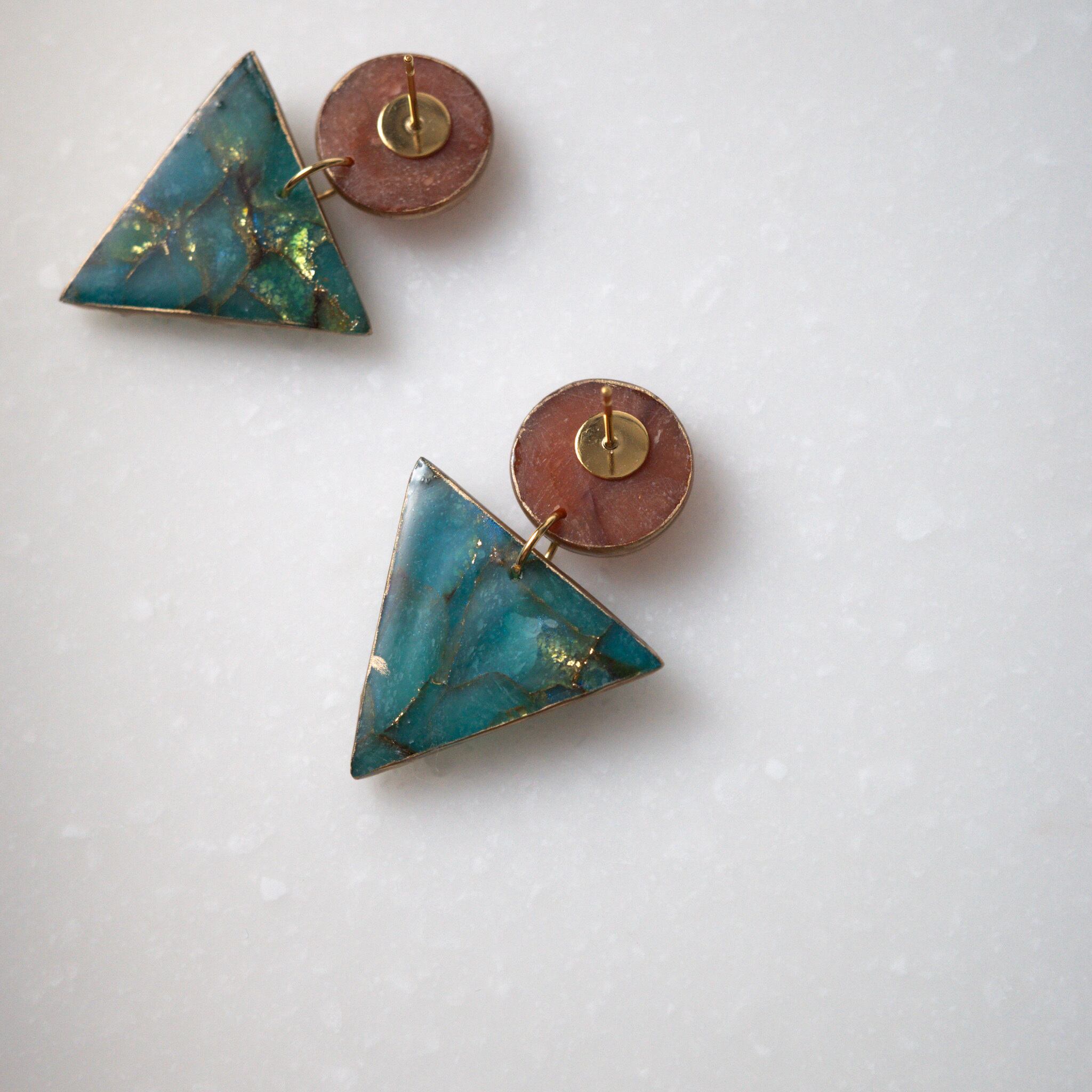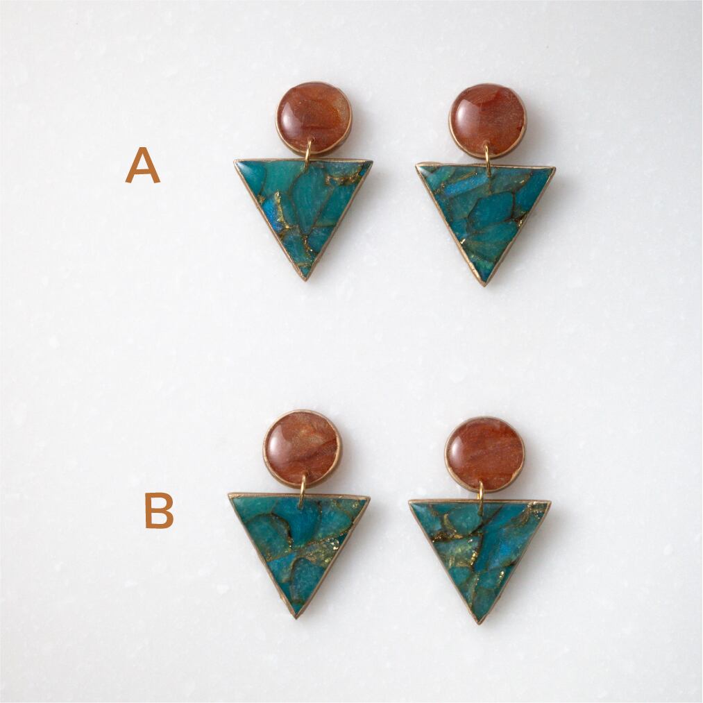 ピーコックグリーンと琥珀のようなブラウンカラーの耳飾り。