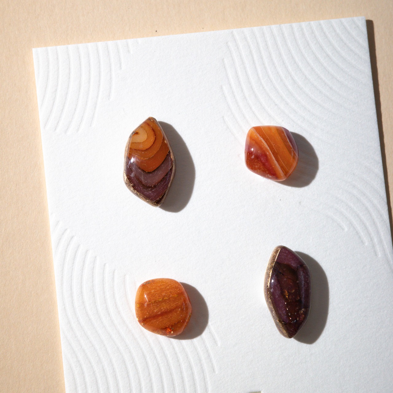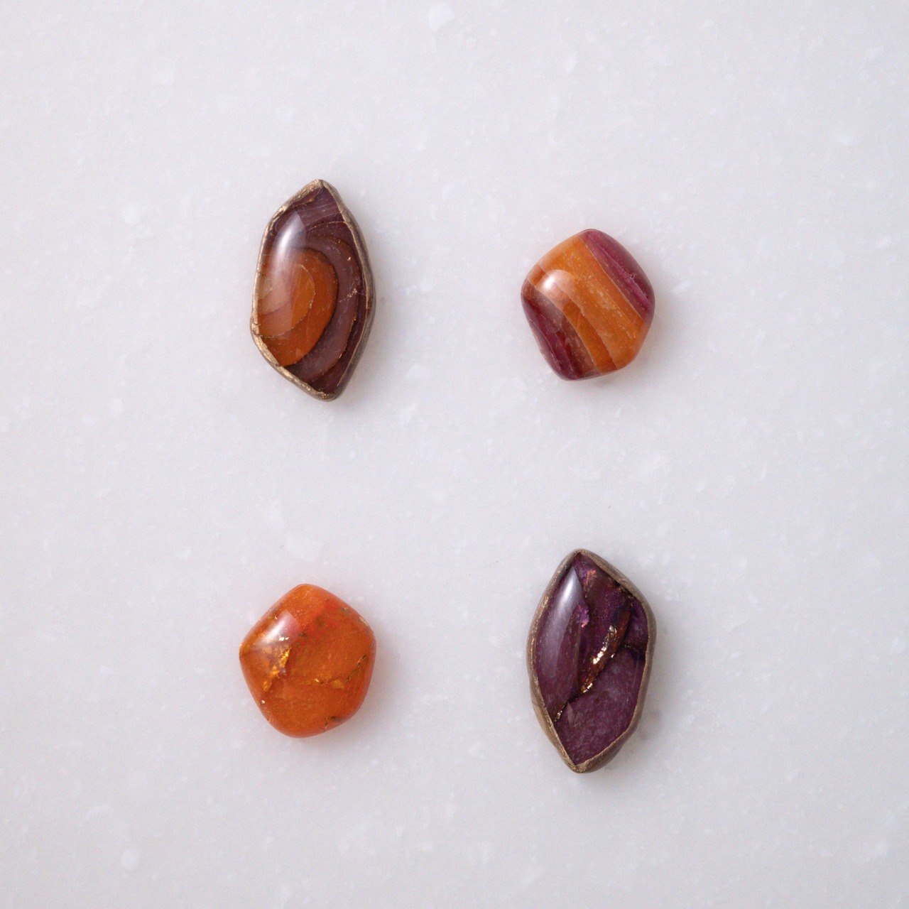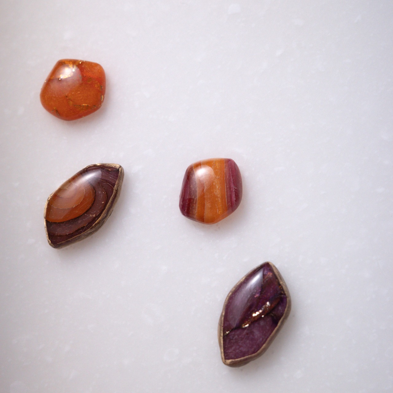 デザインにはポリマークレイと油性顔良インクを使い、上から樹脂コーティングを施しています。