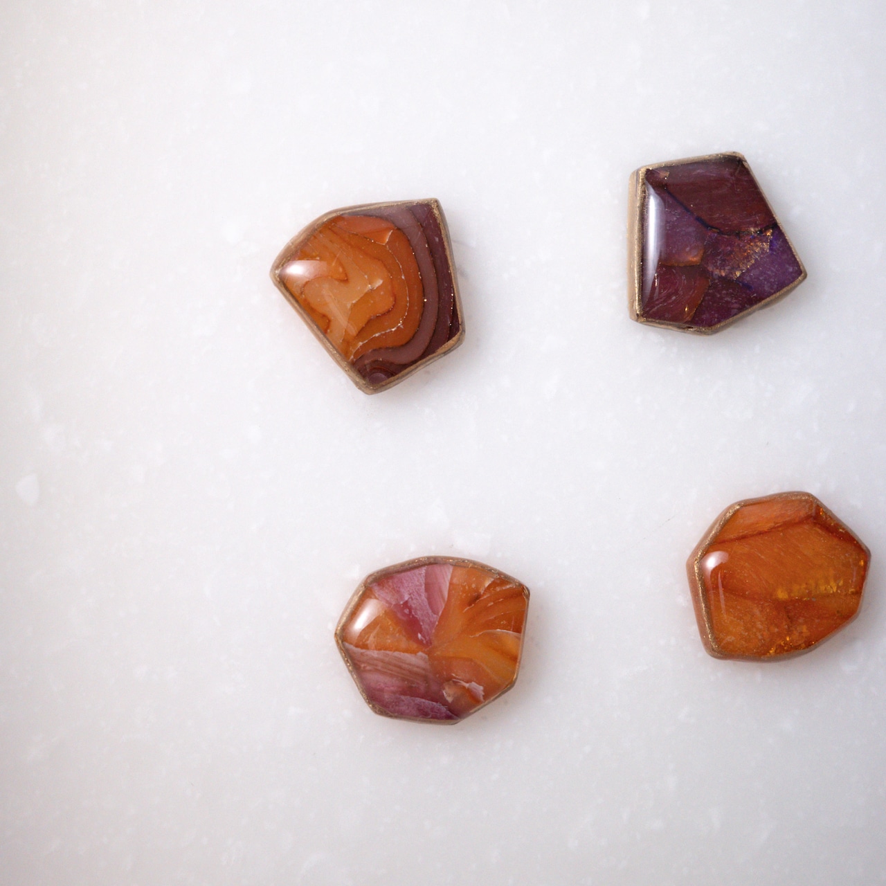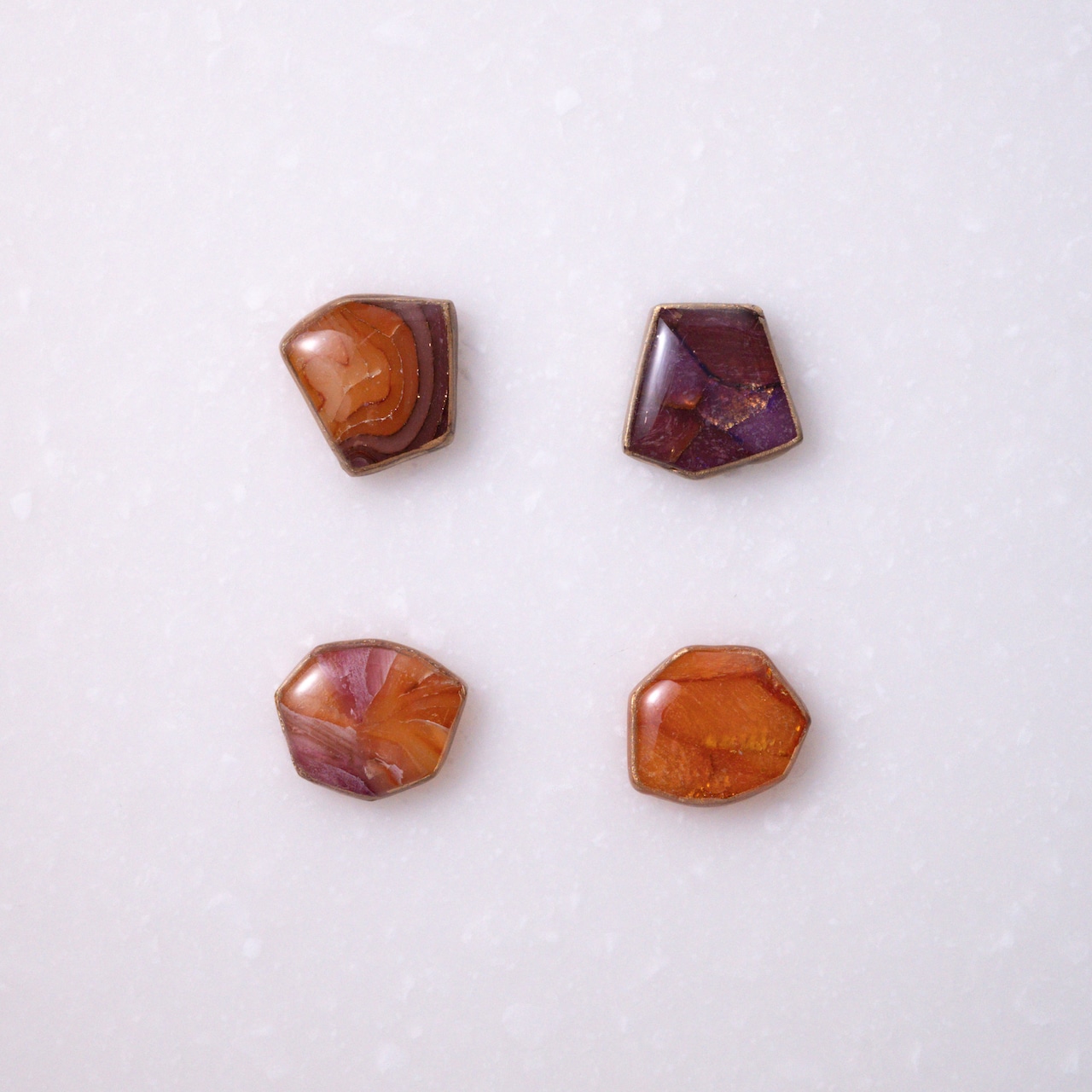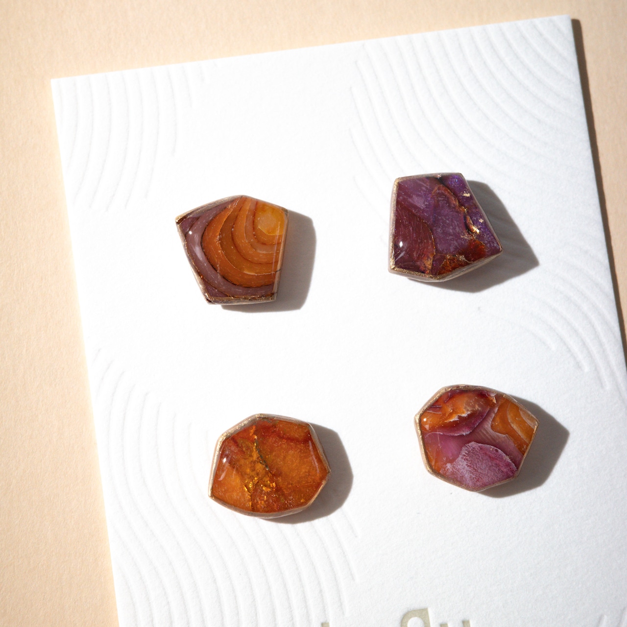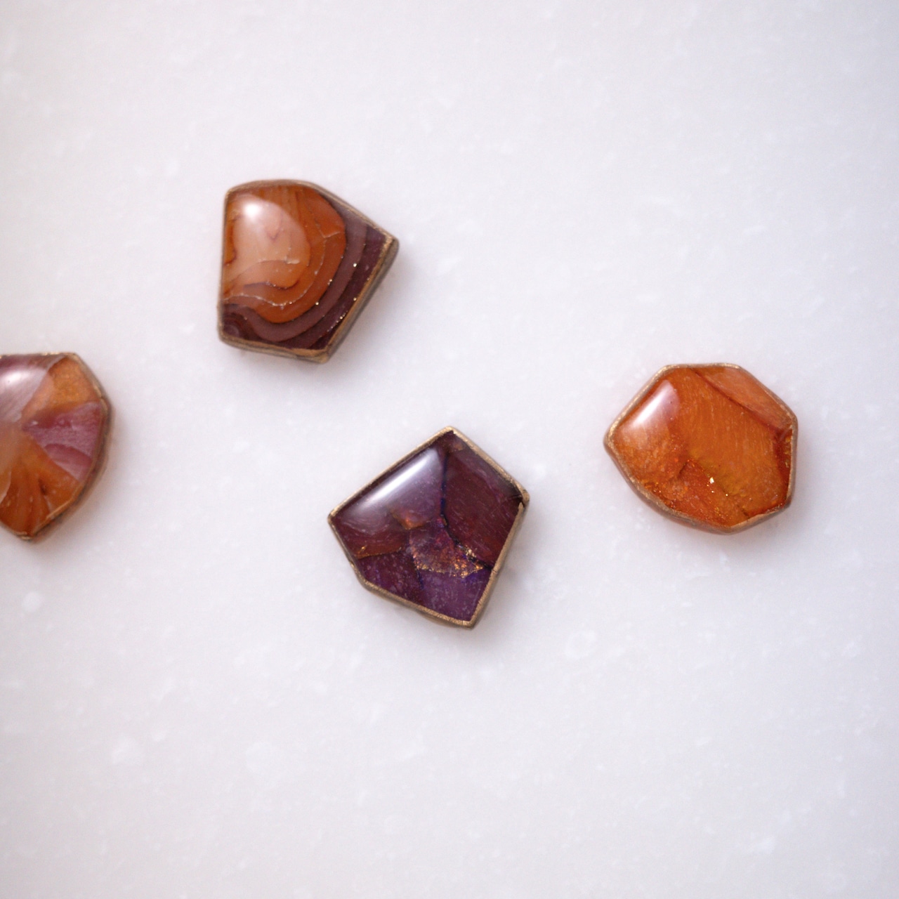 デザインにはポリマークレイと油性顔良インクを使い、上から樹脂コーティングを施しています。