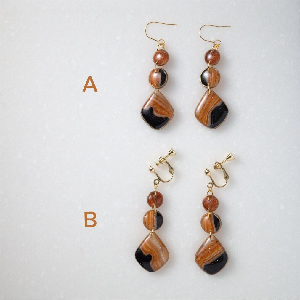 ポリマークレイという焼くと固くなる素材で作成したアクセサリーです。軽量な為、長時間着用しても痛くなりにくい特徴があります。