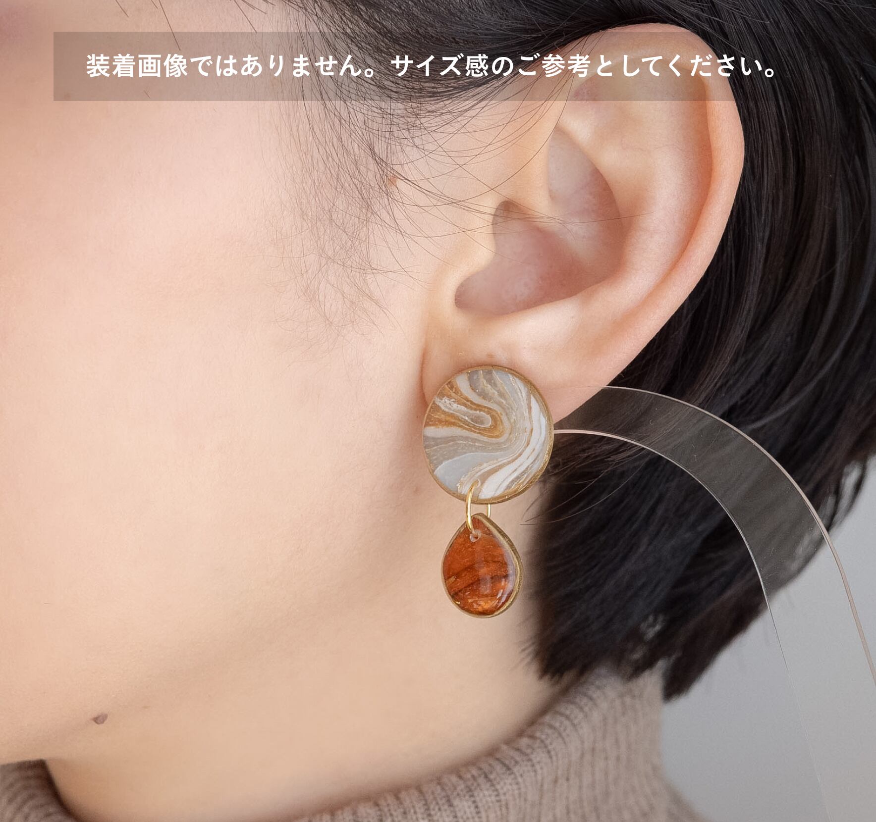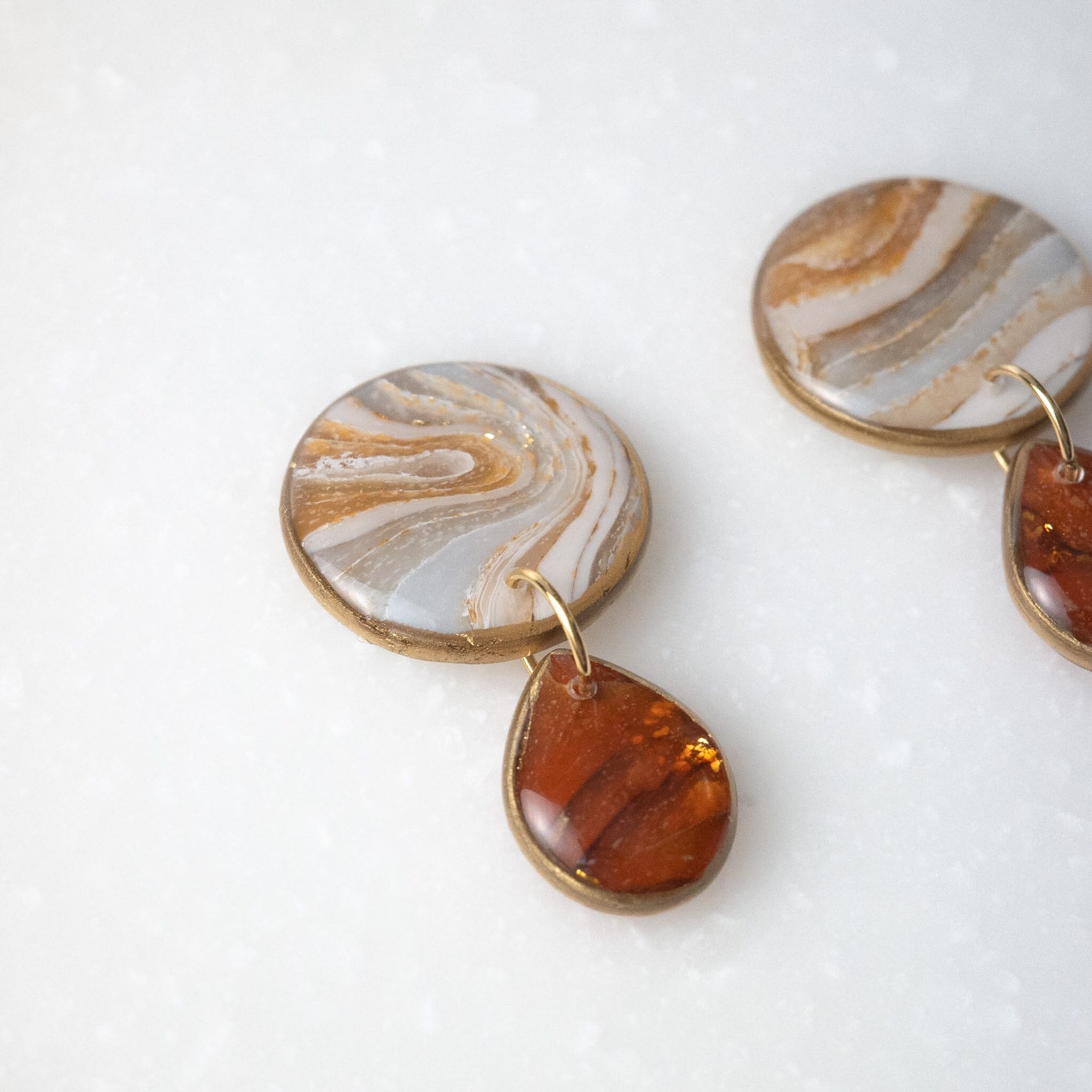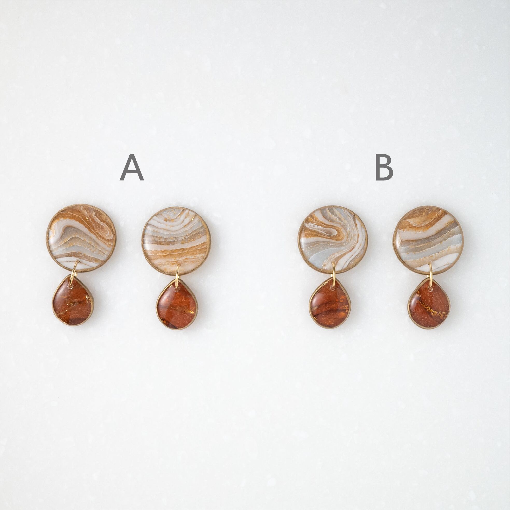 あたたかなブラウンとホワイトのグラデーションが美しい、まるで天然アゲートのような柄の耳飾り。大きめな丸の形から、琥珀色の雫が静かに揺れる、柄をしっかり楽しんでいただけるデザインです。